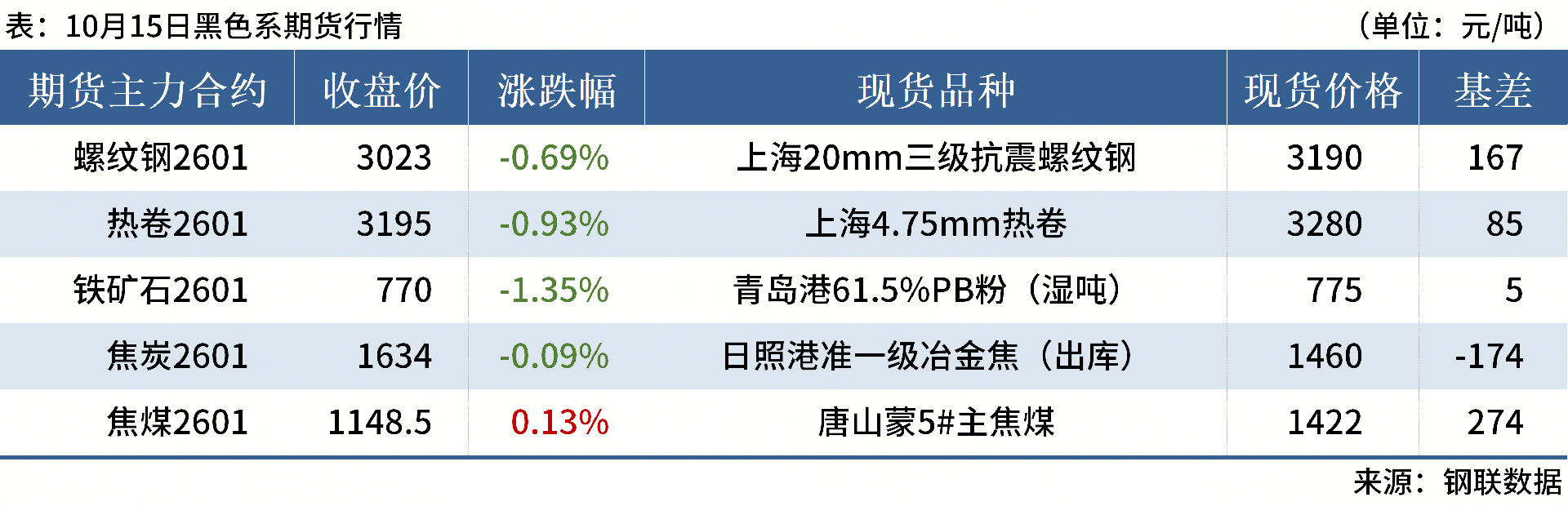 ◎ 10月15日,全國主港鐵礦石成交124.40萬噸,環(huán)比減33.1%;237家主流貿(mào)易商建筑鋼材成交9.14萬噸,環(huán)比減3.4%。