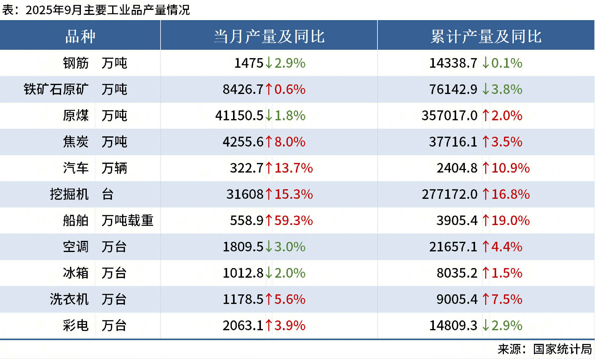 ◎國家統(tǒng)計(jì)局?jǐn)?shù)據(jù)顯示:9月中國鋼筋產(chǎn)量為1475.0萬噸,同比下降2.9%;1-9月累計(jì)產(chǎn)量為14338.7萬噸,同比下降0.1%。其他主要工業(yè)品產(chǎn)量如下: